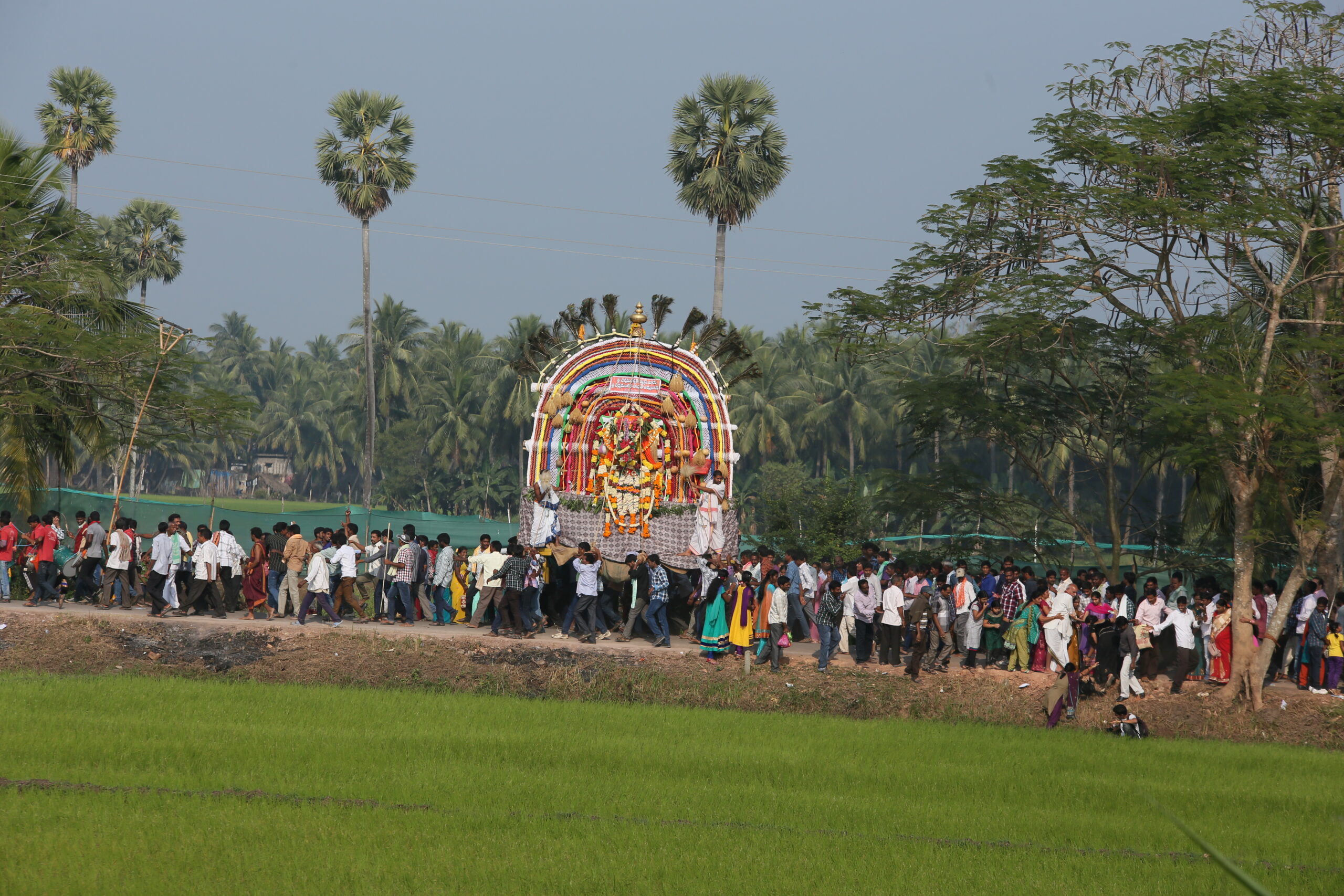 As the Prabhas make their way through the paddy fields, crops are inevitably trampled. However, the landowners do not lament these losses. Instead, they rejoice, believing that having the Sri Ekadasa Rudras pass through their fields is a divine blessing. They see it as a fortune that brings prosperity and happiness to their families.