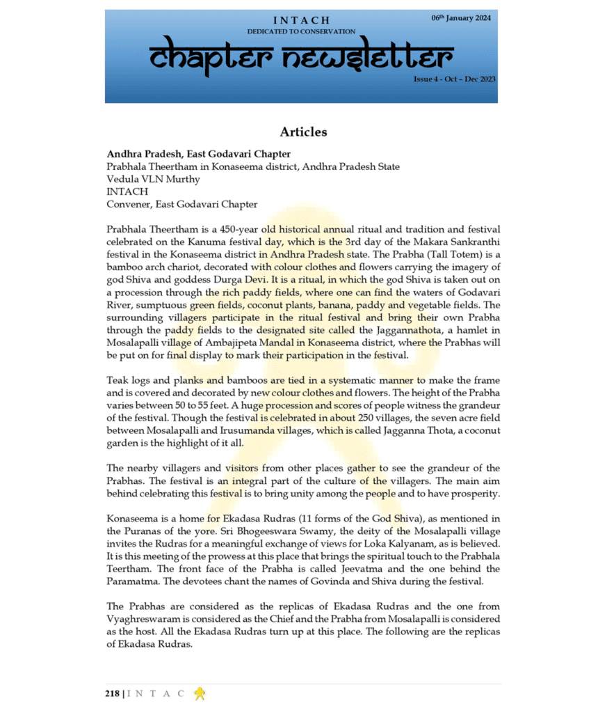 INTACH‘s Andhra Pradesh chapter’s newsletter as special article featuirng Prabhala Theertham