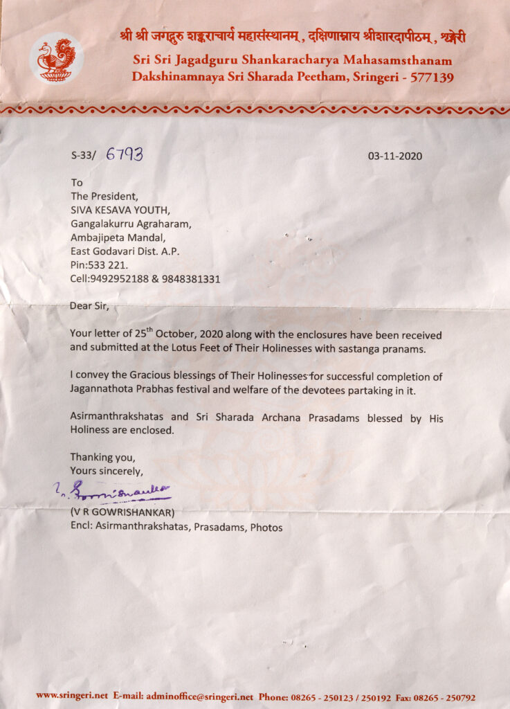 Acknowlegement & anugraha letter from Dakshiamnaya Sri Sharada Peetham, Sringeri upon receipt of photos & videos of Prabhala Theertham