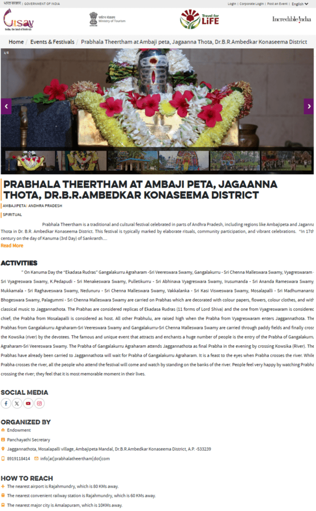 Jagannathota Prabhala Theertham listed under ‘Events & Festivals’ on Utsav portal of Ministry of Tourism
